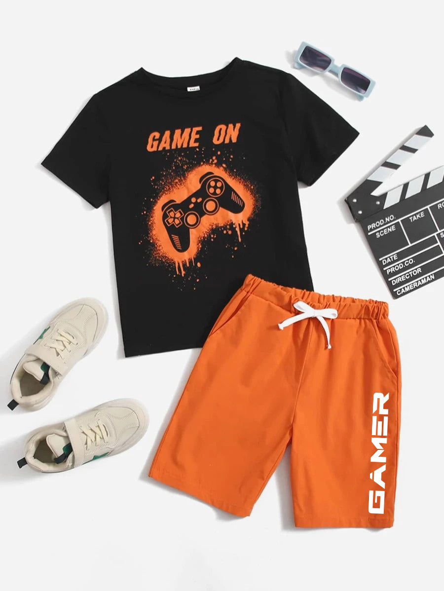 Black Graphic Game On Printed T-Shirt & Orange Short Set