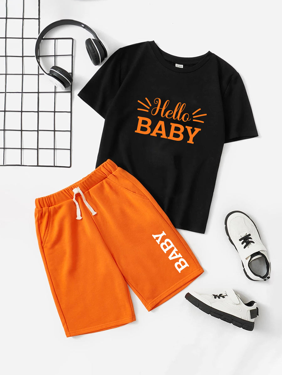Black Hello Baby T-Shirt & Orange Printed Short Set