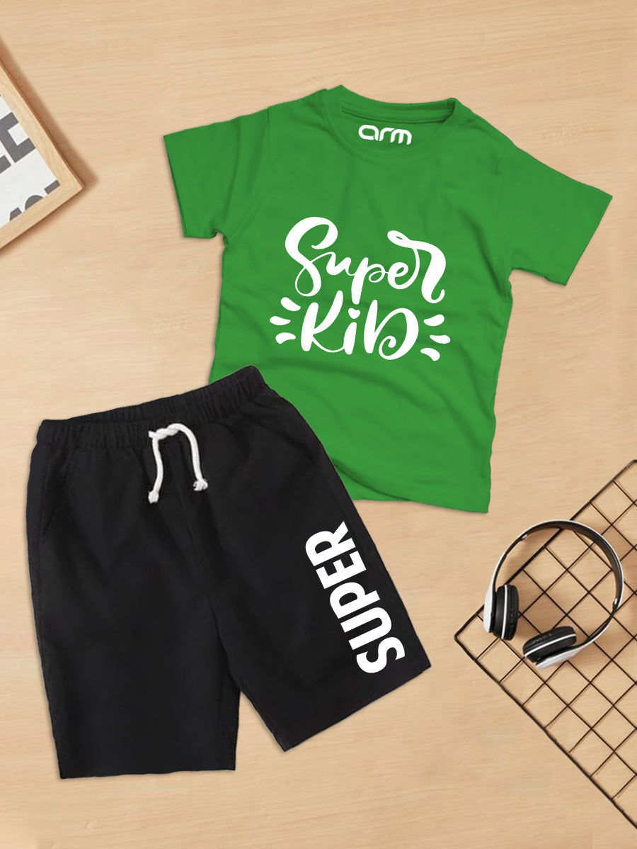 • Graphic Printed Super Kid T-Shirt in Green & Black  Super Short.