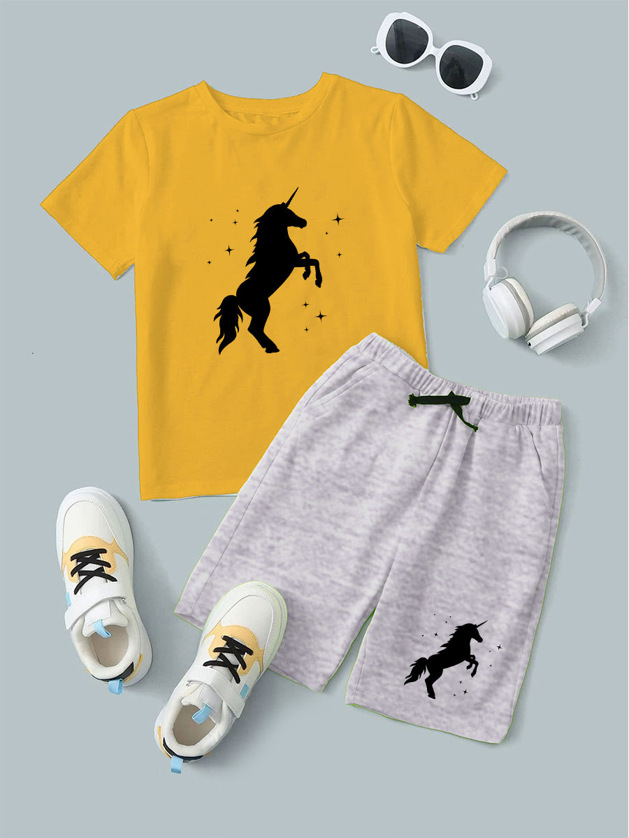 Yellow Unicorn Printed T-Shirt & Black Short Set